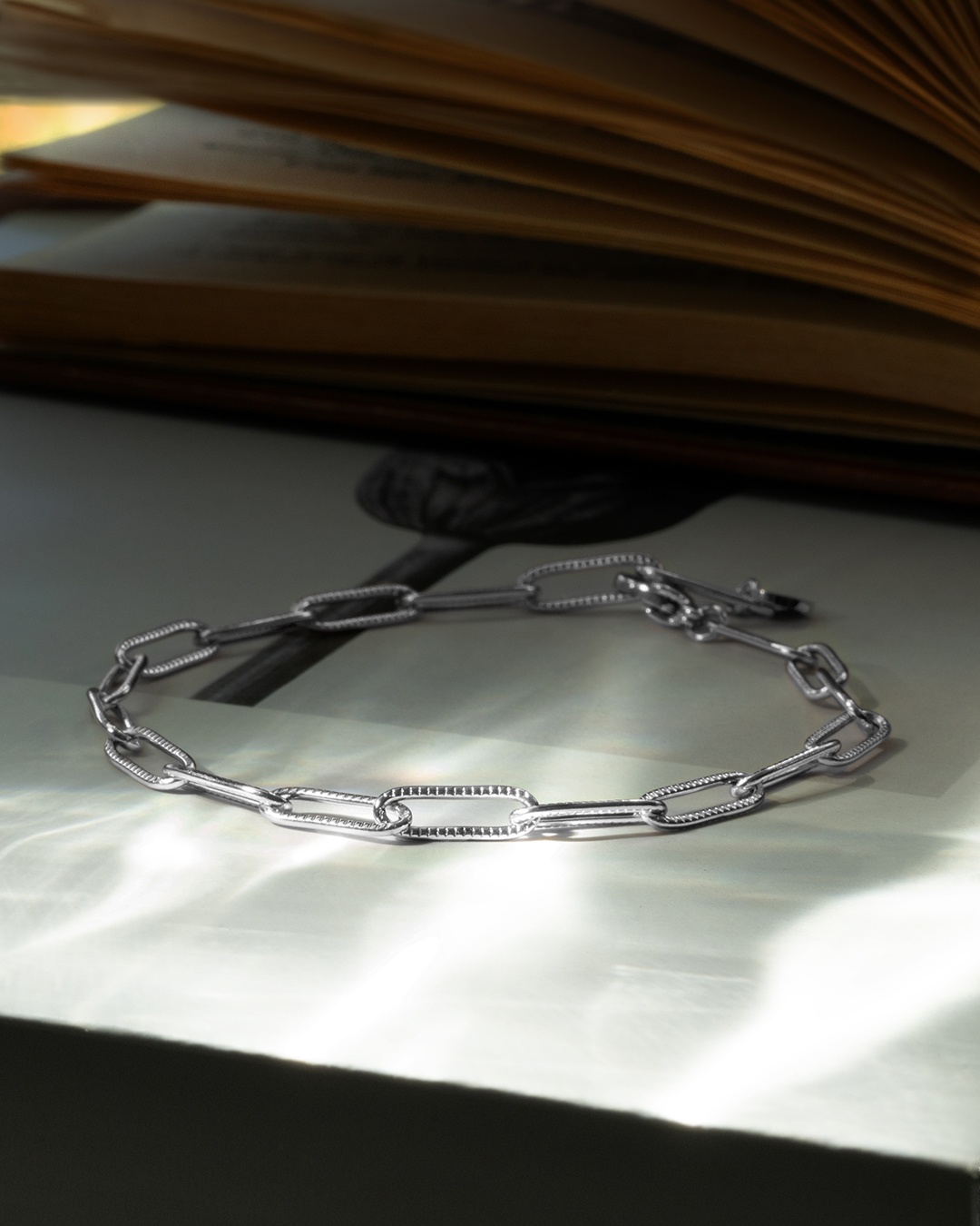 Il bracciale Gaia è composto da una catena, ornata da delicati maglie martellate, in acciaio inossidabile argentato.