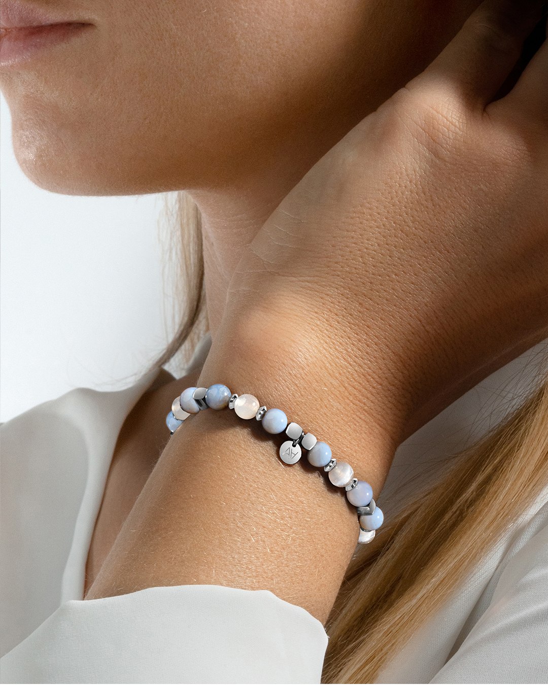 La dimensione simbolica di questa associazione è anche potente. Il bracciale evoca la serenità della Vergine Maria e l'anima del saggio della tradizione indiana, ricordando al contempo il ciclo della nascita, della vita e della morte simboleggiato dalla Selenite.