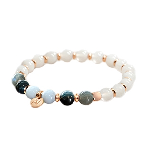 Il resto del bracciale è interamente composto da Pietra di luna, una gemma apprezzata per la sua luminosità madreperlacea e il suo delicato gioco di luce, a volte bluastro, chiamato adularescenza.