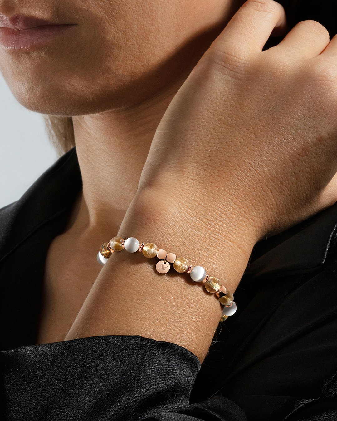 L'energia solare della Citrina si intreccia con la dolcezza luminescente della Selenite, rendendo questo bracciale un talismano di equilibrio e armonia per il corpo e la mente. Questa associazione richiama il gioco perpetuo tra lo yin e lo yang, tra la forza dinamica e la quiete rassicurante.