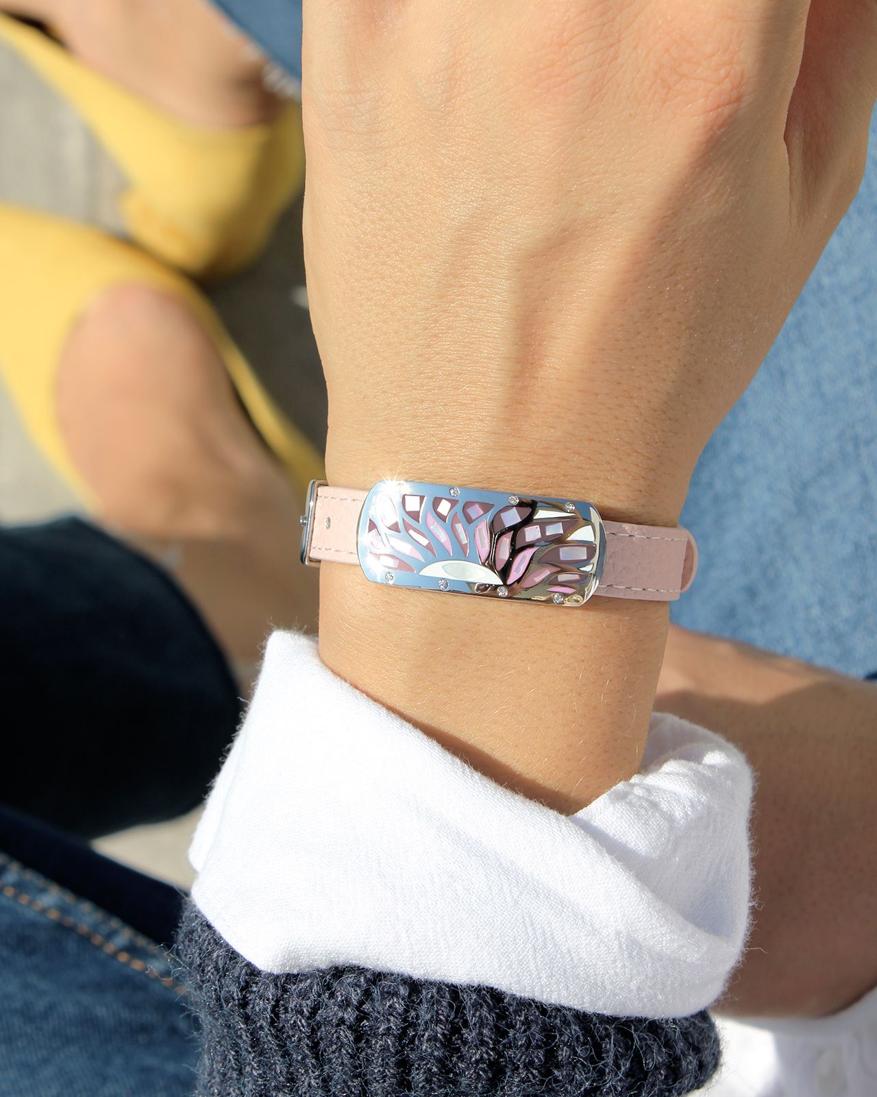 Le rose pâle de son bracelet cuir complétera à la perfection vos tenues et fera de lui l'accessoire essentiel à votre look !