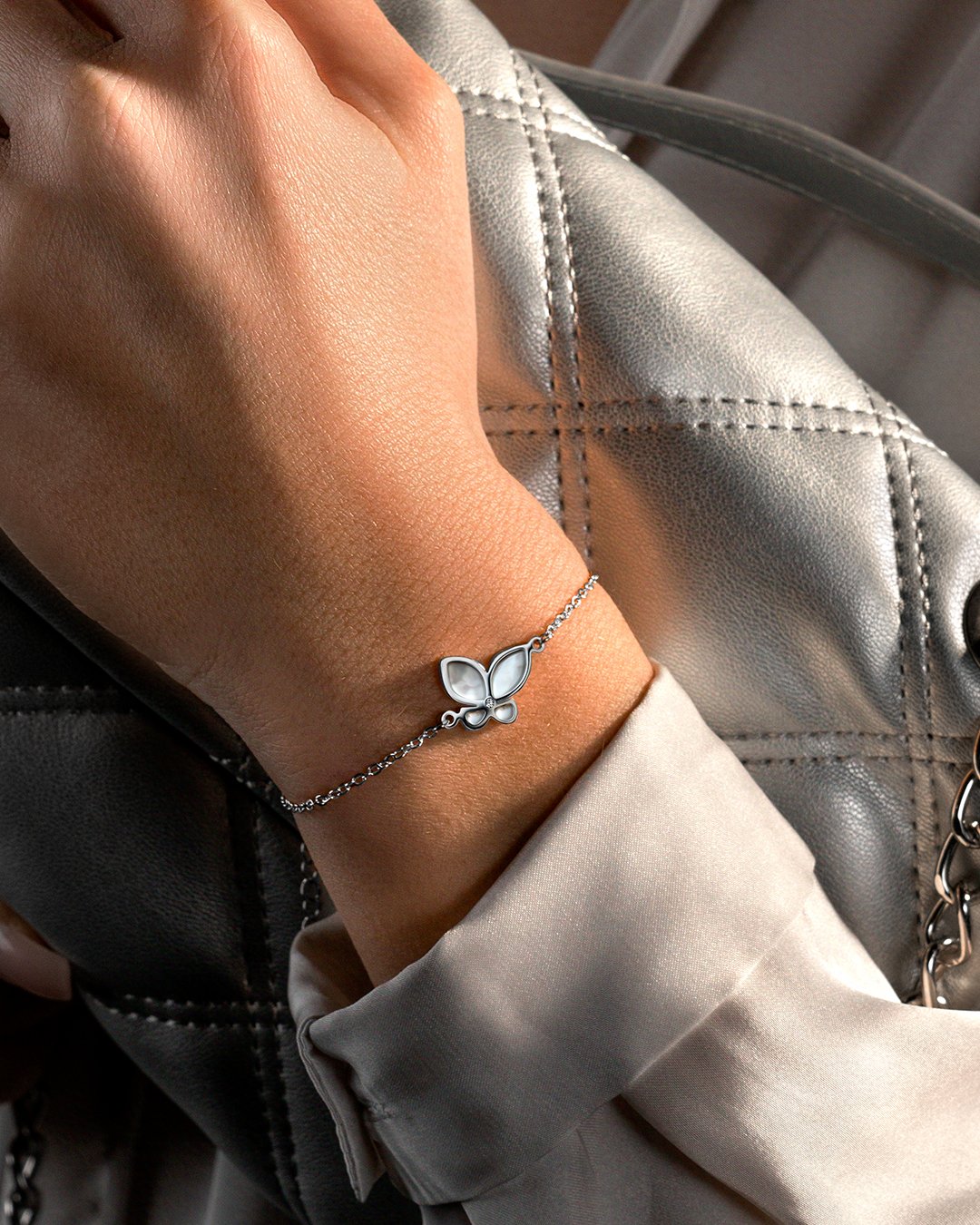 Il bracciale Farfallatti è composto da un pezzo di madreperla accompagnato da strass e una catenina in acciaio inossidabile.