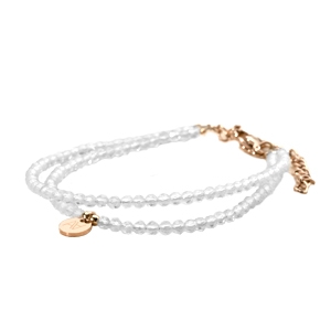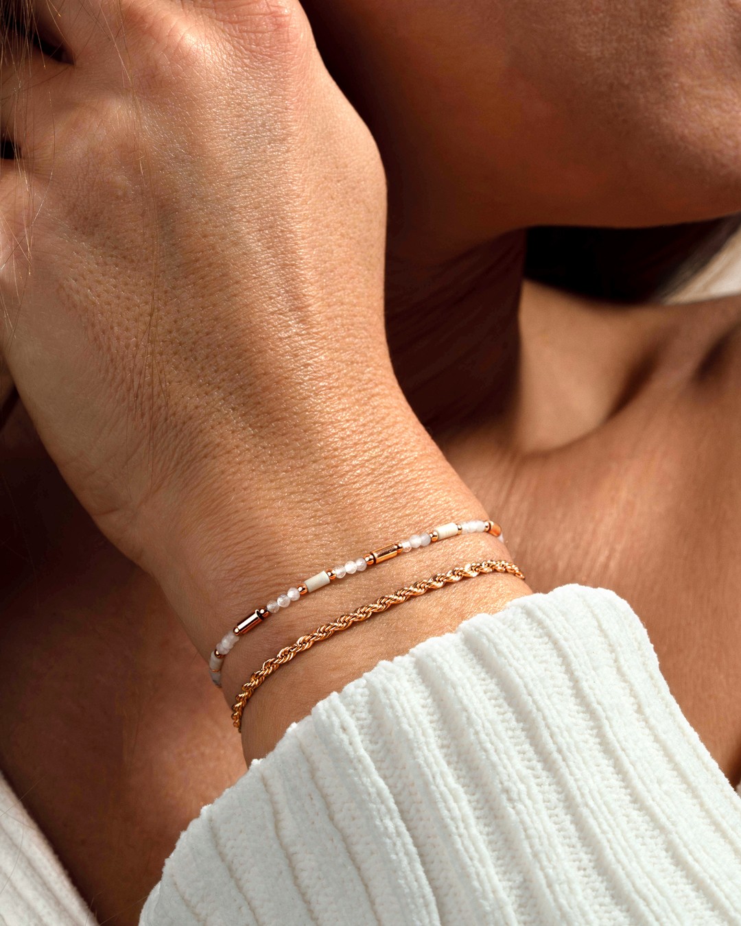 Il bracciale Vigolina è composto da perle sfaccettate di Pietra di Luna, nota per le sue virtù calmanti e intuitive, e da tubi di Marmo Bianco, una pietra rinomata per apportare equilibrio e armonia interiore.