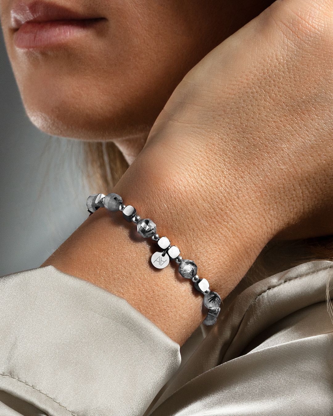 Gli splendidi riflessi delle magnifiche pietre in quarzo rutilato tormalinato sfaccettato adornano il bracciale Riminona.