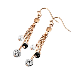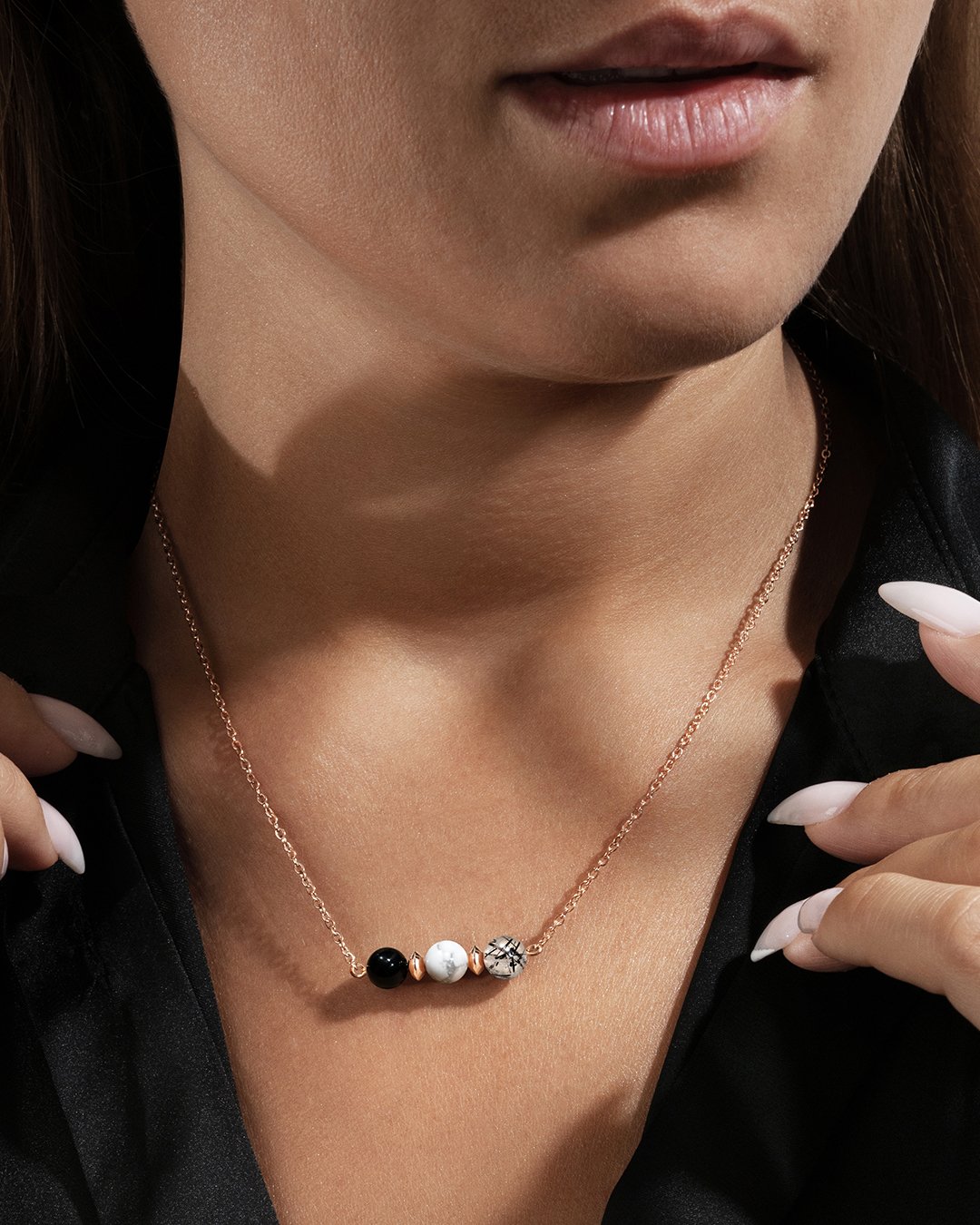Il collier Benessere si distingue per le sue tre magnifiche pietre naturali, accuratamente disposte tra separatori in acciaio rosato: un Quarzo Rutilato, una Howlite e un Onice.