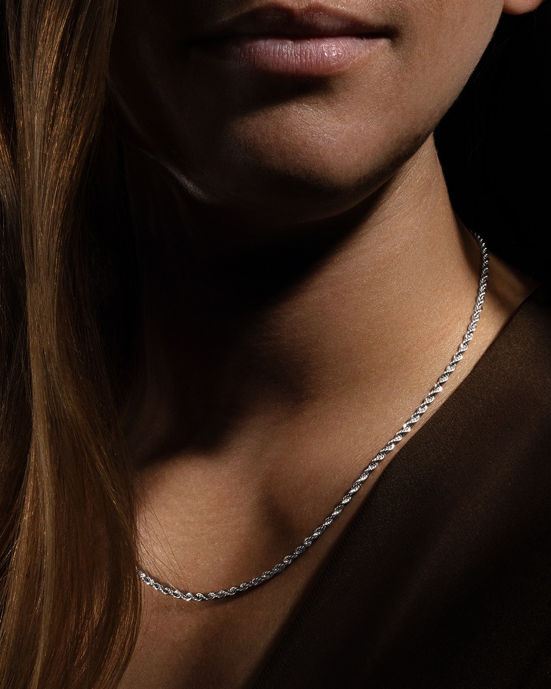 La collana Mina si caratterizza per una catena delicatamente intrecciata in acciaio inossidabile argentato.