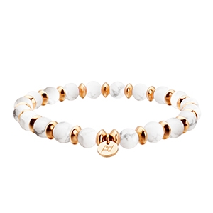 La collana Alcamina è composta da 3 pietre in howlite, disposte con cura tra distanziatori in acciaio rosato.