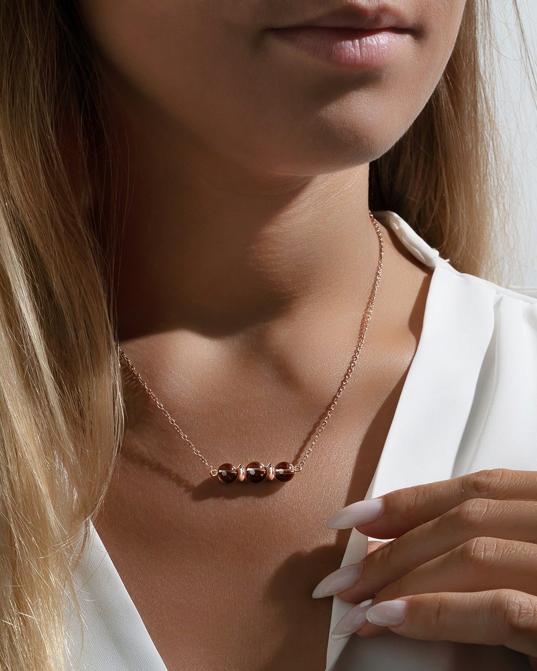 La collana Catanina è composta da 3 pietre di quarzo fumé, disposte meticolosamente tra distanziatori in acciaio rosato.