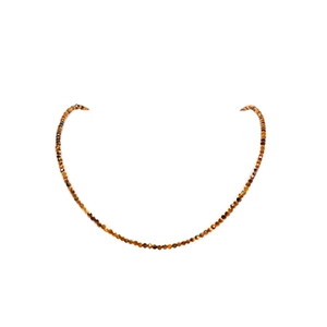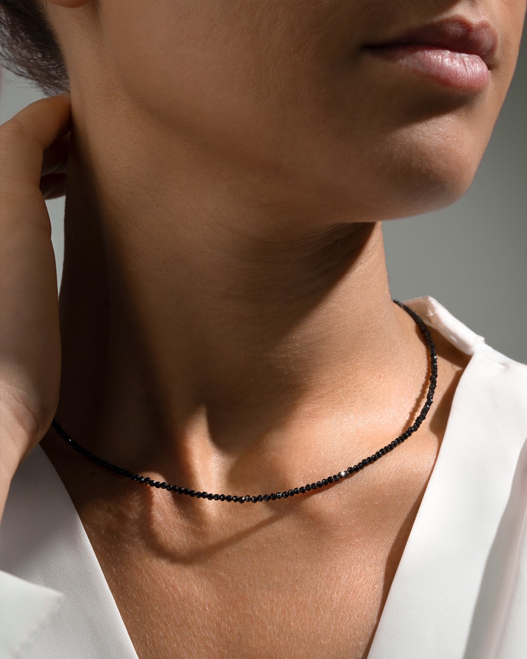 La collana Leona mette in risalto un delicato girocollo composto da piccole pietre sfaccettate di tormalina nera da 2 mm.