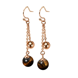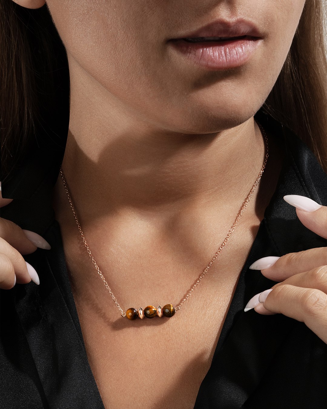 La collana Messina è composta da 3 pietre in occhio di tigre, accuratamente disposte tra distanziatori in acciaio rosato.