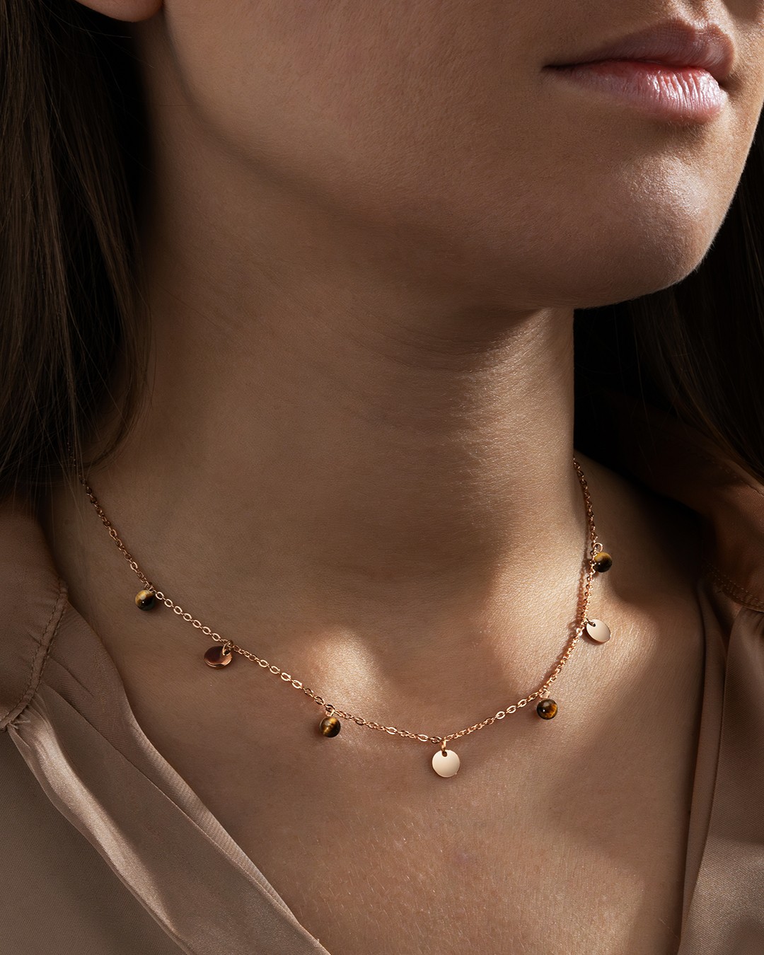 Il collier Messinotto mette in risalto 4 pietre in Occhio di Tigre, accuratamente disposte tra ciondoli in acciaio rosa inossidabile, firmati Anna Velazia.