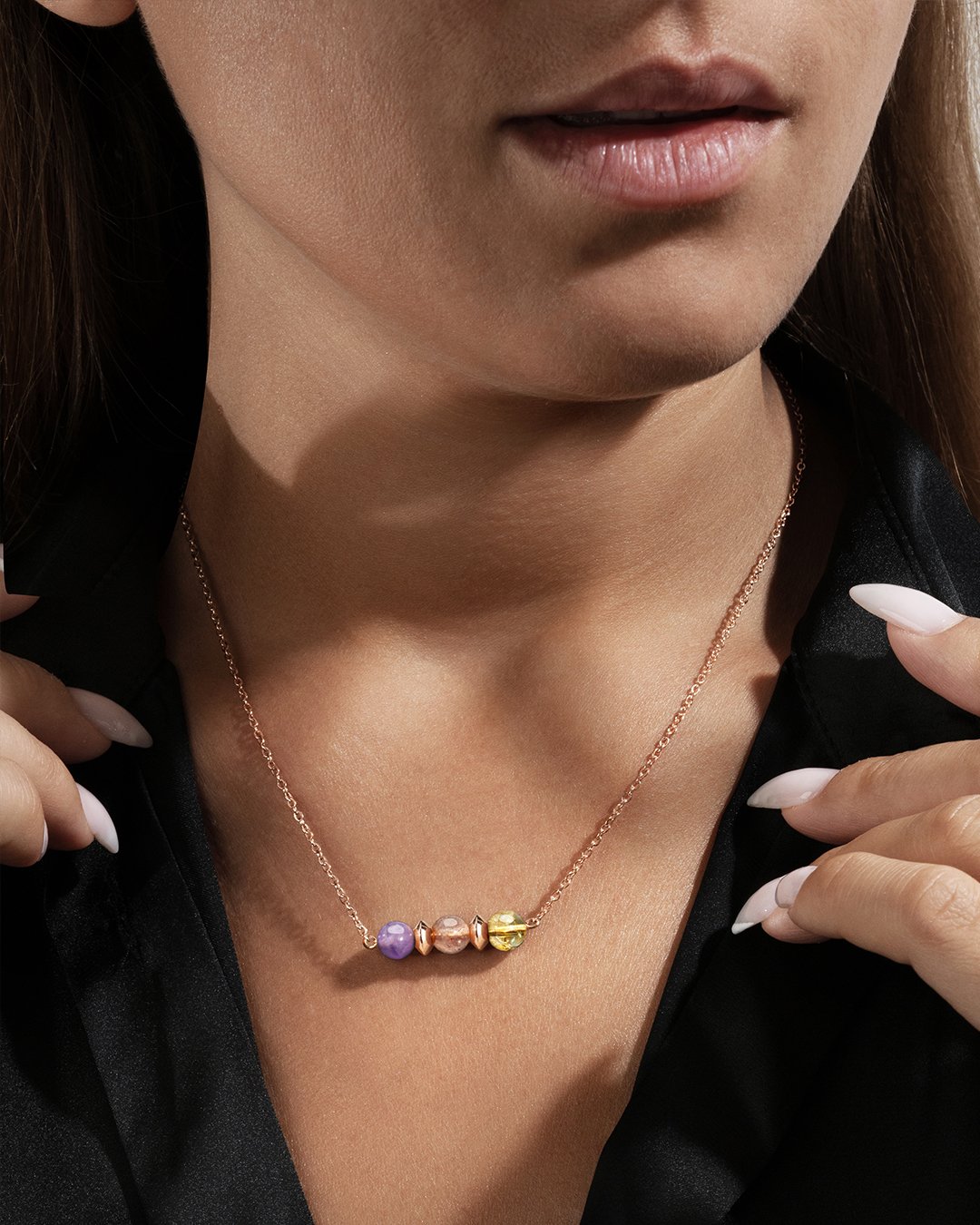 La collana Salentio è composta da 3 magnifiche pietre in super seven, accuratamente disposte tra separatori in acciaio rosato.
