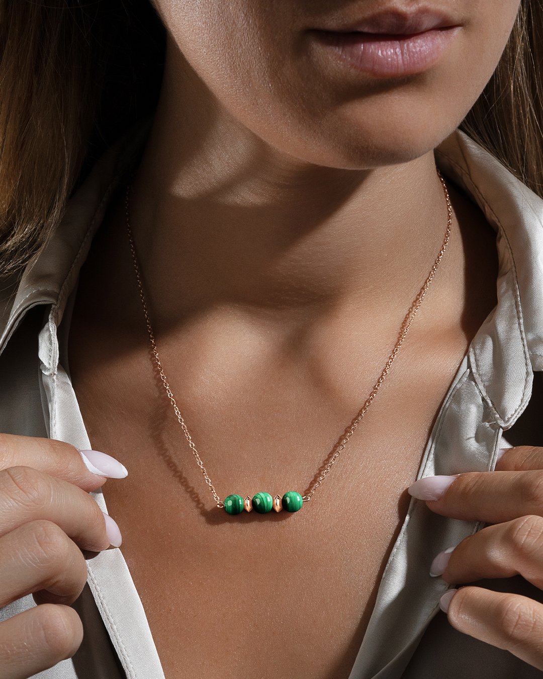 La collana Venozina è composta da 3 splendide pietre di malachite, accuratamente disposte tra distanziatori in acciaio rosato.