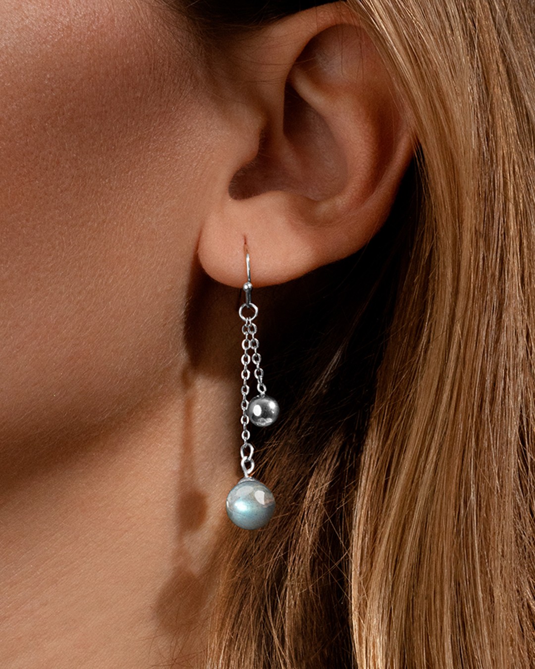 Gli orecchini pendenti Oretti sono adornati con una pietra in labradorite e una sfera in acciaio, delicatamente sospesa. Nella litoterapia, la labradorite ha la virtù di apportare coraggio in situazioni stressanti. I nostri gioielli sono composti da pietre naturali, quindi sono tutti diversi. Di conseguenza, possono apparire differenze di dimensioni e sfumature di colore a seconda dei modelli. Sono queste distinzioni che rendono ogni pietra unica.
