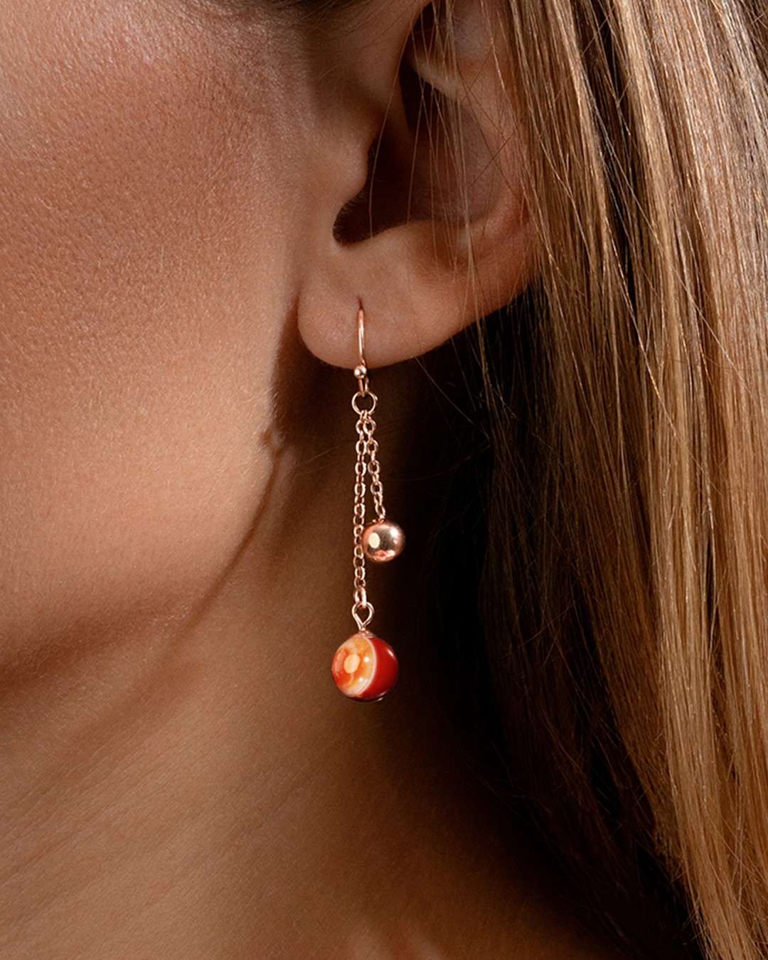 Gli orecchini pendenti Rossoni sono adornati con una pietra in agata rossa striata e una sfera in acciaio rosato, delicatamente sospesa.